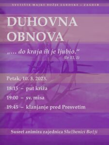 U petak, 10.03., nakon večernje svete mise slijedi klanjanje i blagoslov s Presvetim. Duhovnu obnovu predvodi fra Kristian Radas, a put križa i pjevanje predvodi zajednica Službenici Božji.